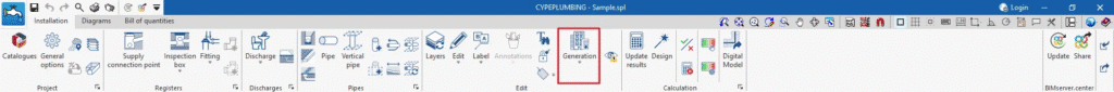 CYPEPLUMBING’e, drenaj sisteminin farklı bölümlerindeki boruların otomatik yerleşimini sağlayan çeşitli yeni özellikler eklendi. Oluşturulan geometri, kullanıcı tarafından daha sonra projenin ihtiyaçlarına göre ayarlanabilir ve değiştirilebilir. Oluşturma seçenekleri, “Kurulum” sekmesinin (“Sıhhi Tesisat Sistemleri”nde) üst araç çubuğunda bulunan yeni “Oluştur” grubunda yer almaktadır.