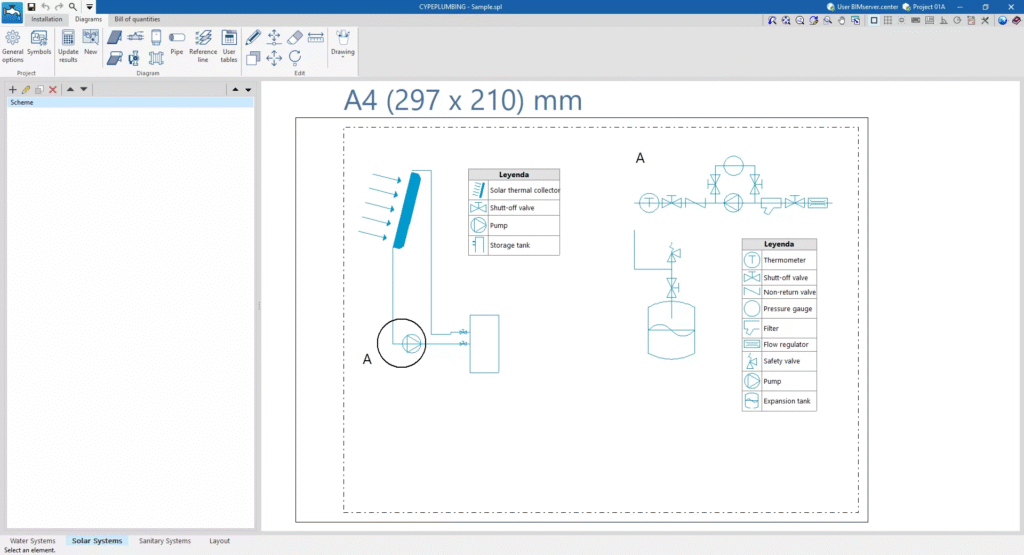 CYPEPLUMBING programındaki “Solar Sistemleri” sekmesinin arayüzünün üst kısmında farklı çalışma ortamlarını içeren üç sekme bulunur: “Kurulum”, “Diyagramlar” ve “Metraj Listesi”. Bu ortamlar, diğer CYPE araçlarındaki ortamlara benzer ve çalışma alanını projenin ihtiyaçlarına göre özelleştirilebilen bir yerleştirilebilir pencere sistemine sahiptir.