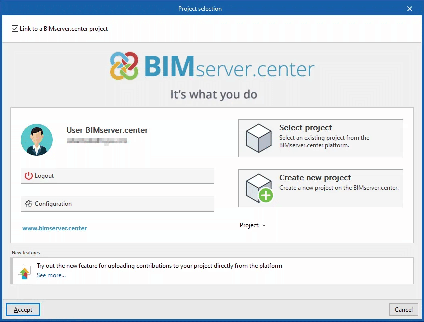 Bu, “Proje seçimi” penceresinde seçilir. Sol tarafta, kullanıcı BIMserver.center hesabıyla giriş yapabilir.